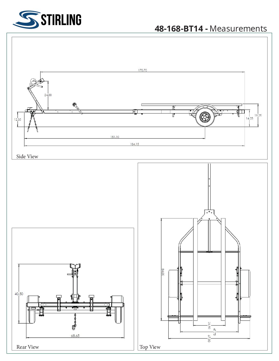 The Stirling 4’ x 14’ Boat Trailer is built for boaters who want a reliable trailer that performs on the road and resists corrosion in both fresh and salt water. Designed to carry boats up to approximately 14 feet long, this trailer features adjustable 84″ bunks that can be tilted, raised, or widened to support a variety of hull shapes and sizes.